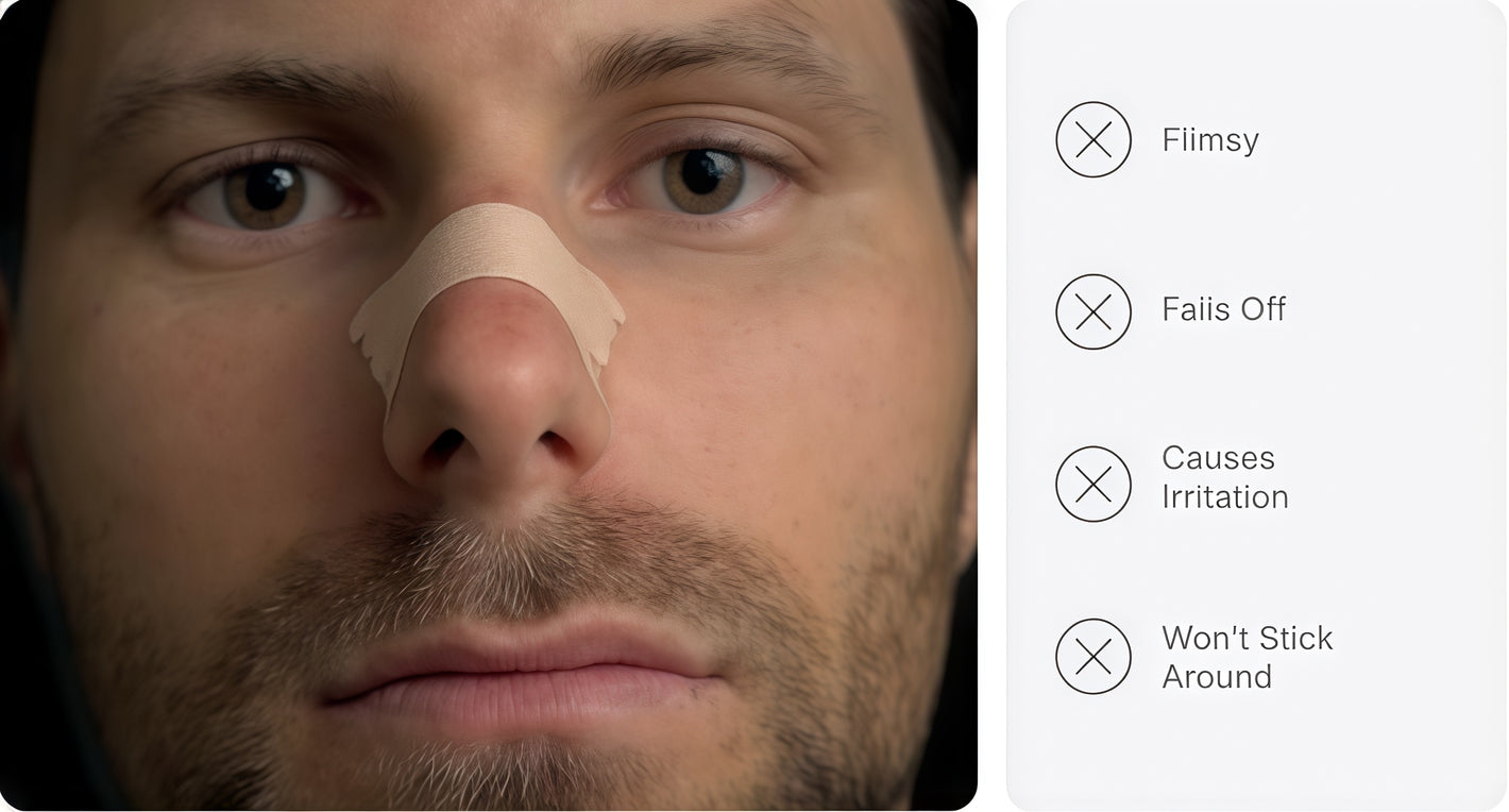 Intake opens your nose to its widest capacity and will not come off during sleep or sweat. Intake's design pulls from the Band, not the skin from the bridge of your nose and won't damage the delicate skin & blood vessels inside your nose.